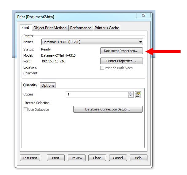 Begin by creating the BarTender template you need. With that done, open the “Print Dialog” window within BarTender (Click on the print icon located in the upper left portion of the tool bar) Do not use Window’s control panel or the print driver to change any settings.