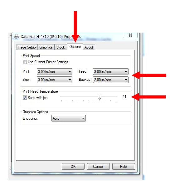 For BarTender users: The Heat setting should be increased (this is the number one overlooked setting). A good range to try is 19-24. Experiment until you achieve good results. Next - Print, Slew and Feed settings should be 3.00 in/sec. Backup should always be a lower value than Print, Slew and Feed. Set to 2.00 in/sec.